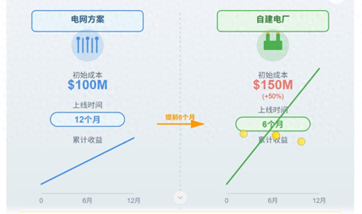 自建电厂的经济逻辑电网方案初始成本$100M上线时间12个月累计收益06月12月自建电厂初始成本$150M(+50%)上线时间6个月累计收益06月12月核心逻辑:提前6个月上线 = 多6个月收益窗口6个月额外收益 > 50%成本差 → 数十亿美元净收益提前6个月